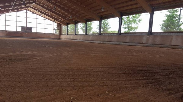 Halle: Die sehr helle Reithalle mit Hufschlag 20 x 45 m ist mit Windschutznetzen ausgestattet, bietet daher optimale Sicht und frische Luft. Die Halle verfügt über eine automatische Bewässerungsanlage. Der Boden besteht aus einem Holz-Sand-Gemisch.